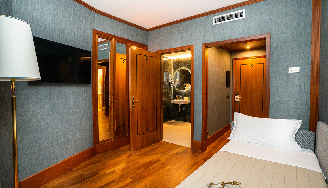 Adatta per soggiorni fino a 3 persone - PIANO EXECUTIVE. Completamente ristrutturata la nostra camera Deluxe si presenta con una camera con letto matrimoniale, toni caldi e pavimento in parquet. Bagno con ampia doccia e rivestimenti in marmo e travertino. Camera comunicante con divano letto. In alcune delle camere è presente un secondo bagno con doccia e rivestimenti in marmo e travertino. Dispone di: - SET cortesia con accappatoio e ciabattine - TV LCD con canali Sky gratuiti - Connessione internet Wi-Fi gratuita - Minibar - Aria condizionata/riscaldamento - Set cortesia in bagno - Asciugacapelli - Telefono - Camera non fumatori Ampio parcheggio gratuito fino ad esaurimento disponibilità. Colonnina ricarica elettrica per auto